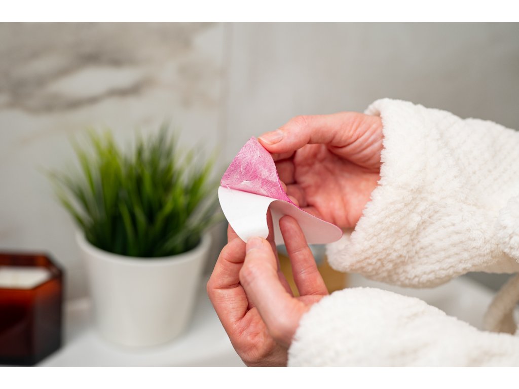 Přiložte masku na pleť bílou stranou – tak, aby barevnou strana směřovala od vaší pokožky. Lehce přitlačte.